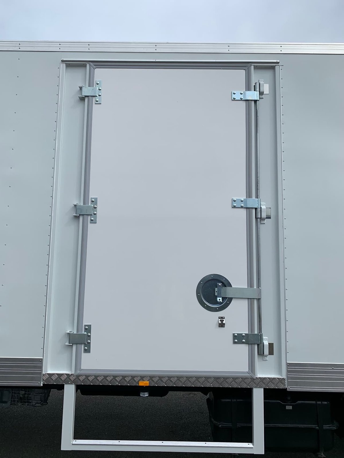 Double rear FRP doors with three hinges, seals, and one camlock per door