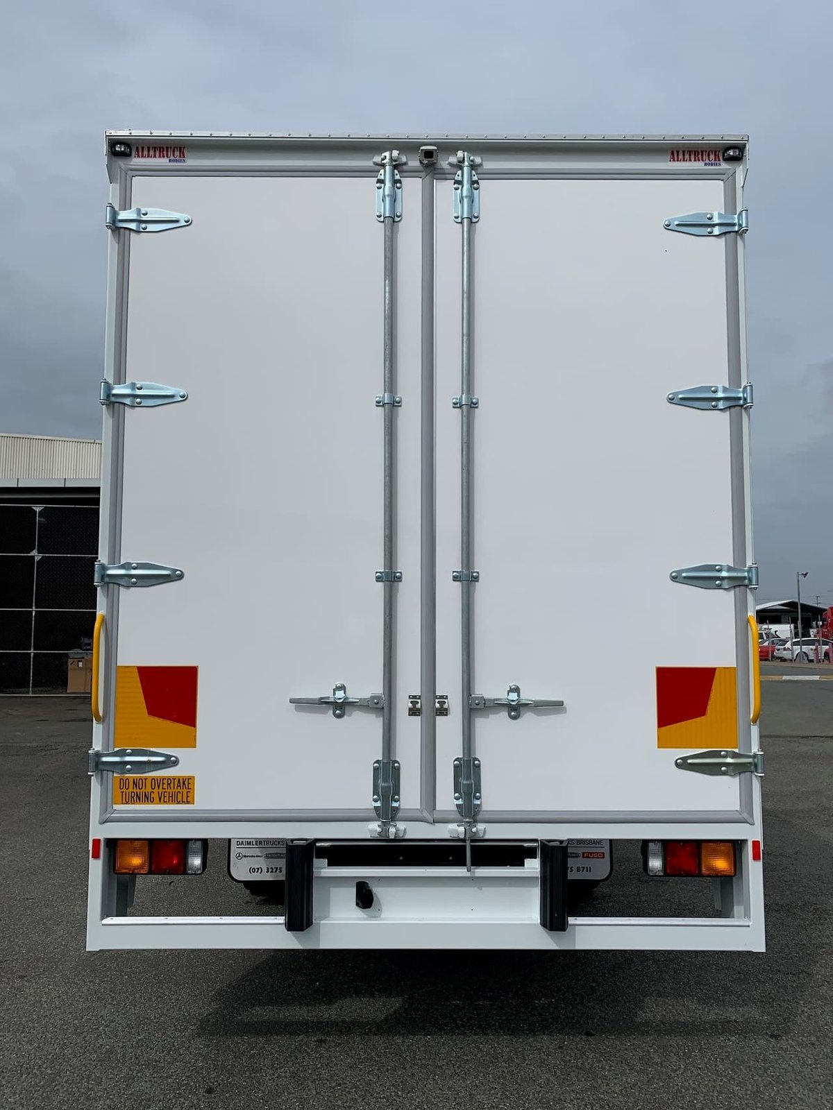 Steel framed van body with RHS framed front wall which meets Load Restraint Guide requirements, and 3mm ply lining between frame and flat white Colorbond® exterior.