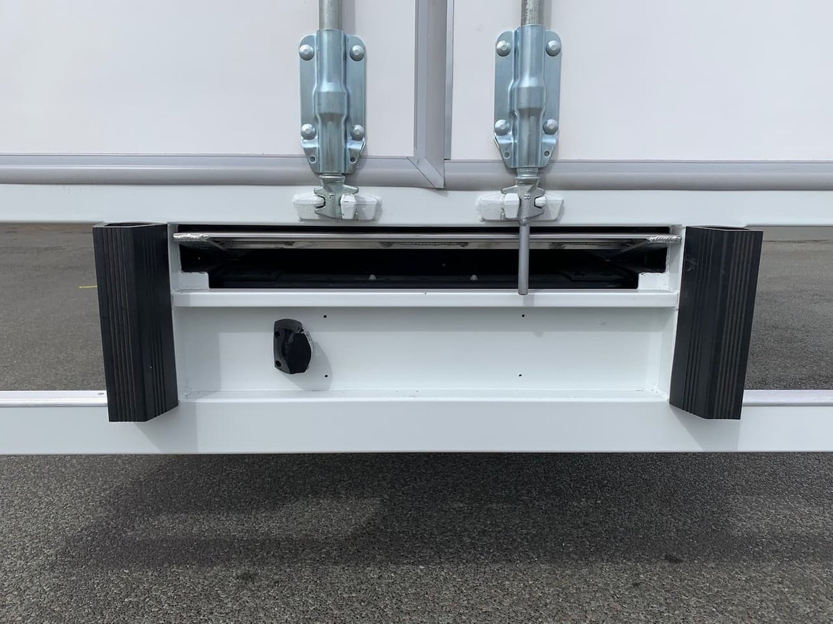 Pallet width FRP side door with recessed lock, and step, and safety grab handle inside doorway.
