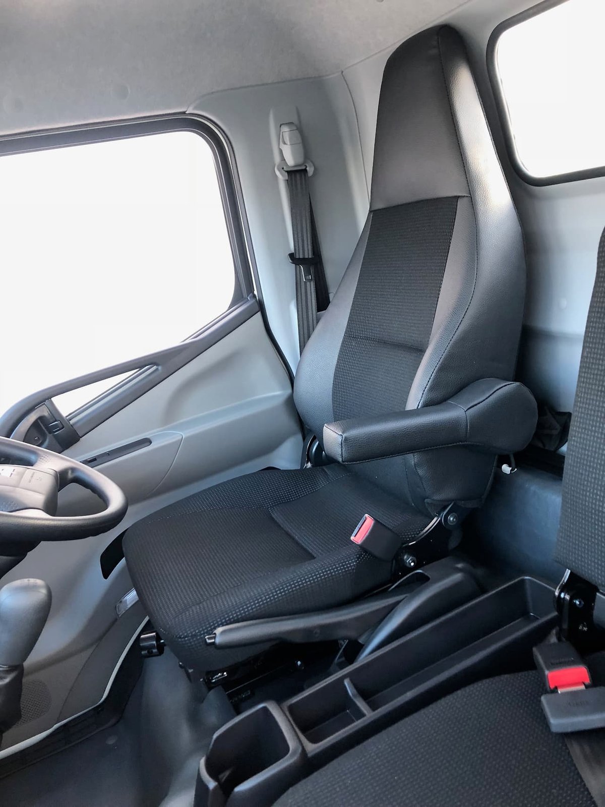 Suspended driver seat with left hand folding arm rest, lumber support and weight adjustment.